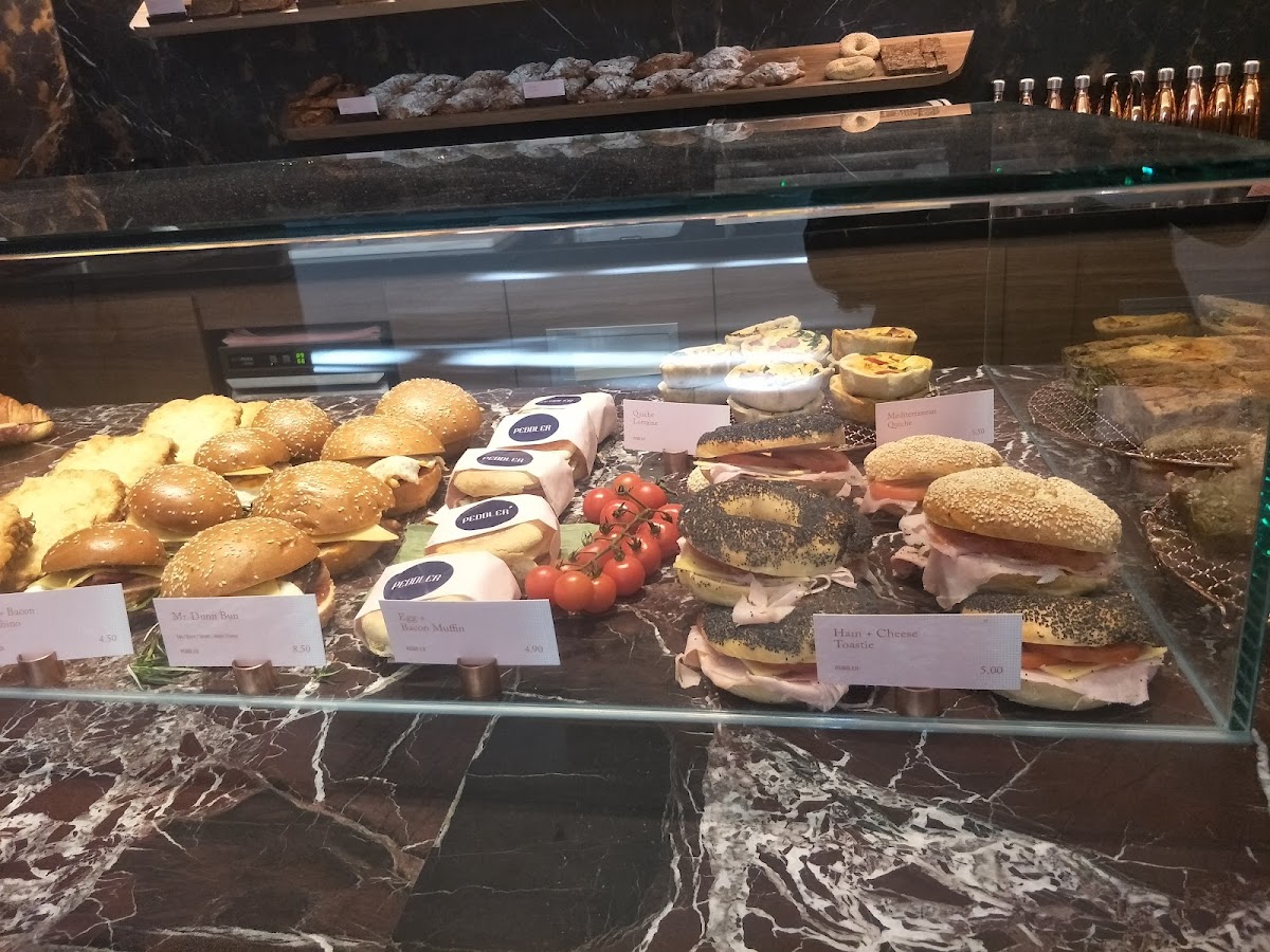 Food options, though limited, lean toward simple, satisfying fare like cheese and tomato toasties or a cheese buffet, perfect for a light bite before or after traveling. The variety in the cabinet offers a mixture of sweet and savory treats that complement the coffee well, making it useful for a quick breakfast or a midday pause.